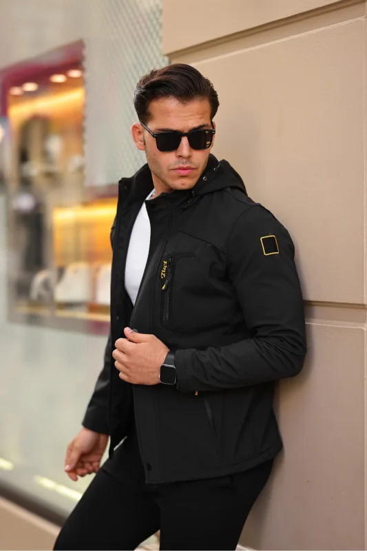 Erkek Siyah Kapüşonlu Softshell Su Ve Rüzgar Geçirmez Içi Kürklü Kapüşonlu Mont